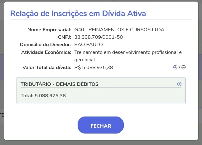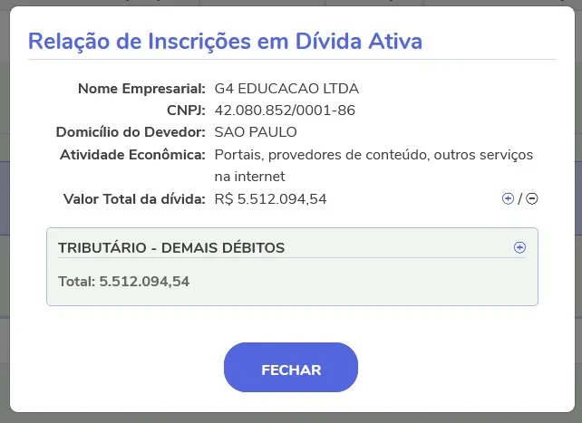 Duas empresas de Tallis Regence Coelho Gomes, a G4 Educação Ltda e a G40 Treinamentos e Cursos Ltda, devem R$ 5,5 milhões e R$ 5 milhões em impostos à União, respectivamente. As duas estão inscritas na Lista de Devedores da Procuradoria Geral da Fazenda Nacional.