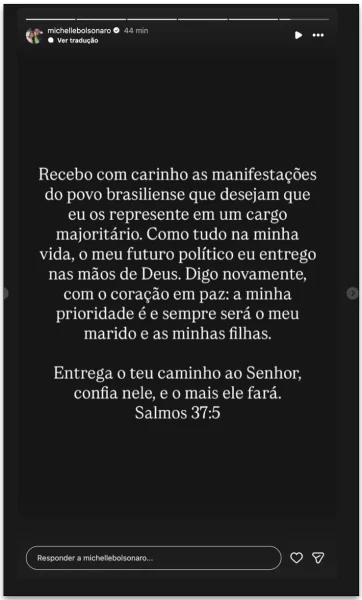 Em manifestação nas redes sociais no sábado (14), Michelle disse receber com “carinho as manifestações do povo brasiliense”, mas não confirmou a intenção de concorrer. “Como tudo na minha vida, o meu futuro político eu entrego nas mãos de Deus. Digo novamente, com coração em paz: a minha prioridade é e sempre será o meu marido e as minhas filhas”, escreveu.