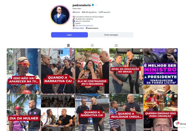 O influenciador, que tem 99 mil seguidores no Instagram, se diz “cristão” e costuma fazer vídeos ridicularizando pautas de esquerda e pessoas da comunidade LGBTQIA+. Além dos famosos “reacts”, ele segue o modelo padrão de blogueiros do tipo: entrevistar pessoas nas ruas e usar cortes de respostas absurdas.