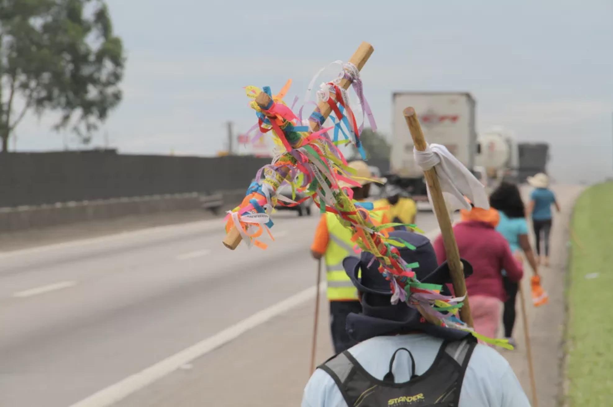 Romeiros levam cruz em peregrinação pela rodovia Dutra para a Festa da Padroeira em Aparecida