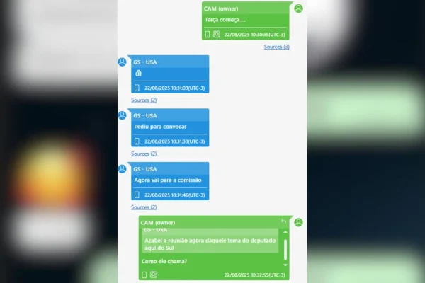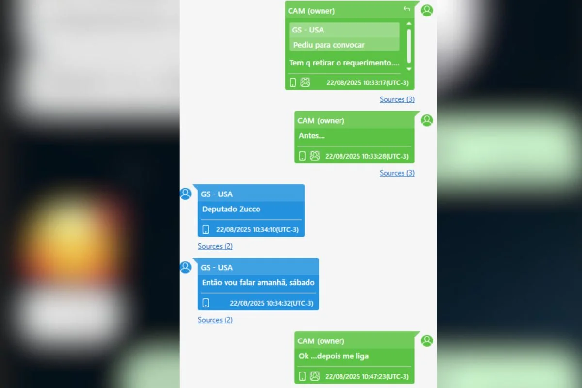 Em um trecho, “GS-USA” menciona uma reunião sobre um “deputado aqui do Sul”, em referência a Zucco. Em outra conversa, relata um encontro na Churrascaria Rodeio, no Shopping Iguatemi (São Paulo), dizendo ter participado de uma reunião com seis pessoas, entre elas Rodrigo Califoni, executivo do grupo de Camisotti.