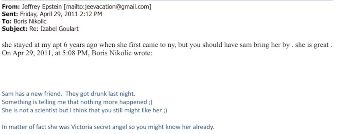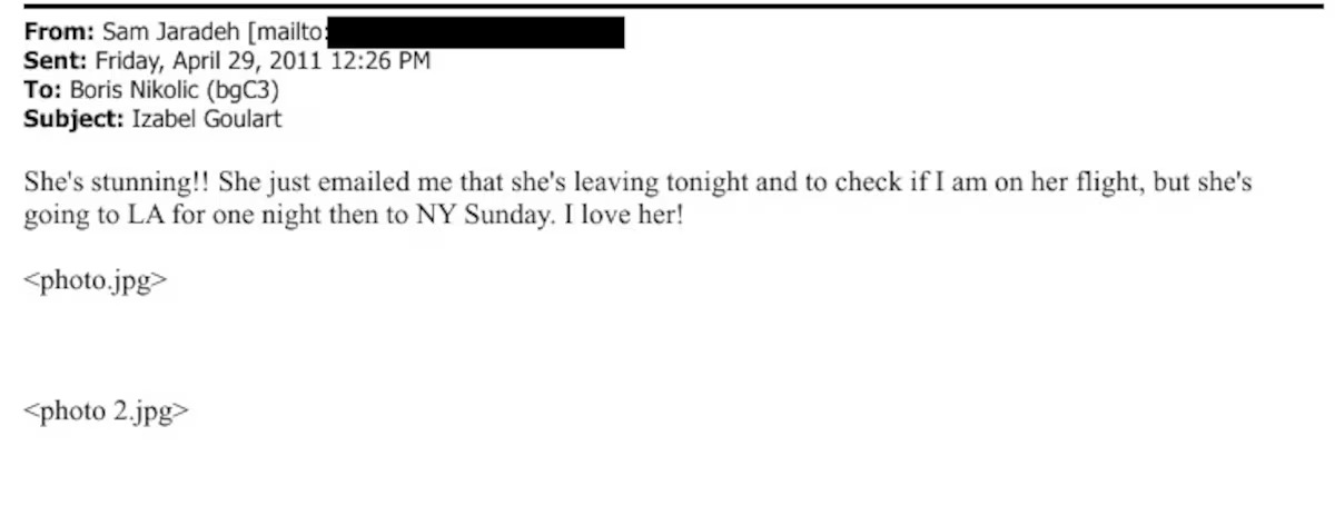 Izabel aparece em mensagens trocadas em 29 de abril de 2011 entre Sam Jaradeh, o financista sérvio Boris Nikolic — descrito como funcionário da Fundação Gates, de Bill Gates — e Epstein.