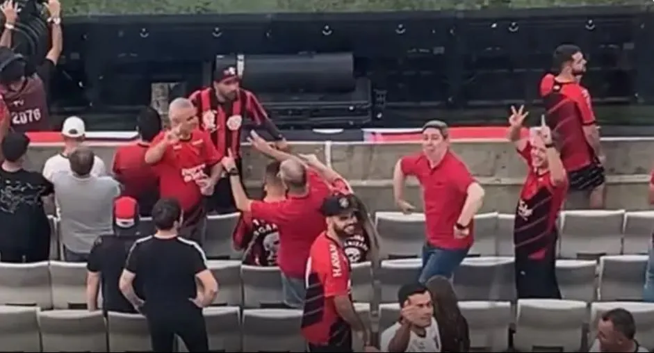 Torcedores do Athletico-PR fazendo gestos racistas para torcida adversária